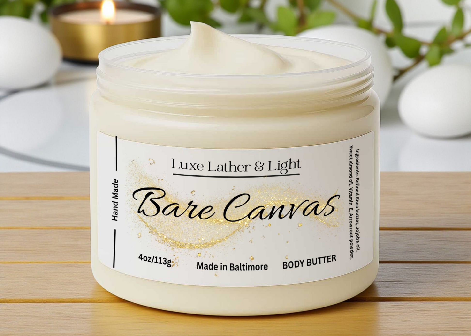 Softness, uninterrupted. Bare Canvas is a whisper-light blend—pure, comforting, and quietly luxe. This whipped body butter melts into skin like silk, leaving behind nothing but a smooth, hydrated glow. No frills. No distractions. Just you, your softness, and a fresh start.