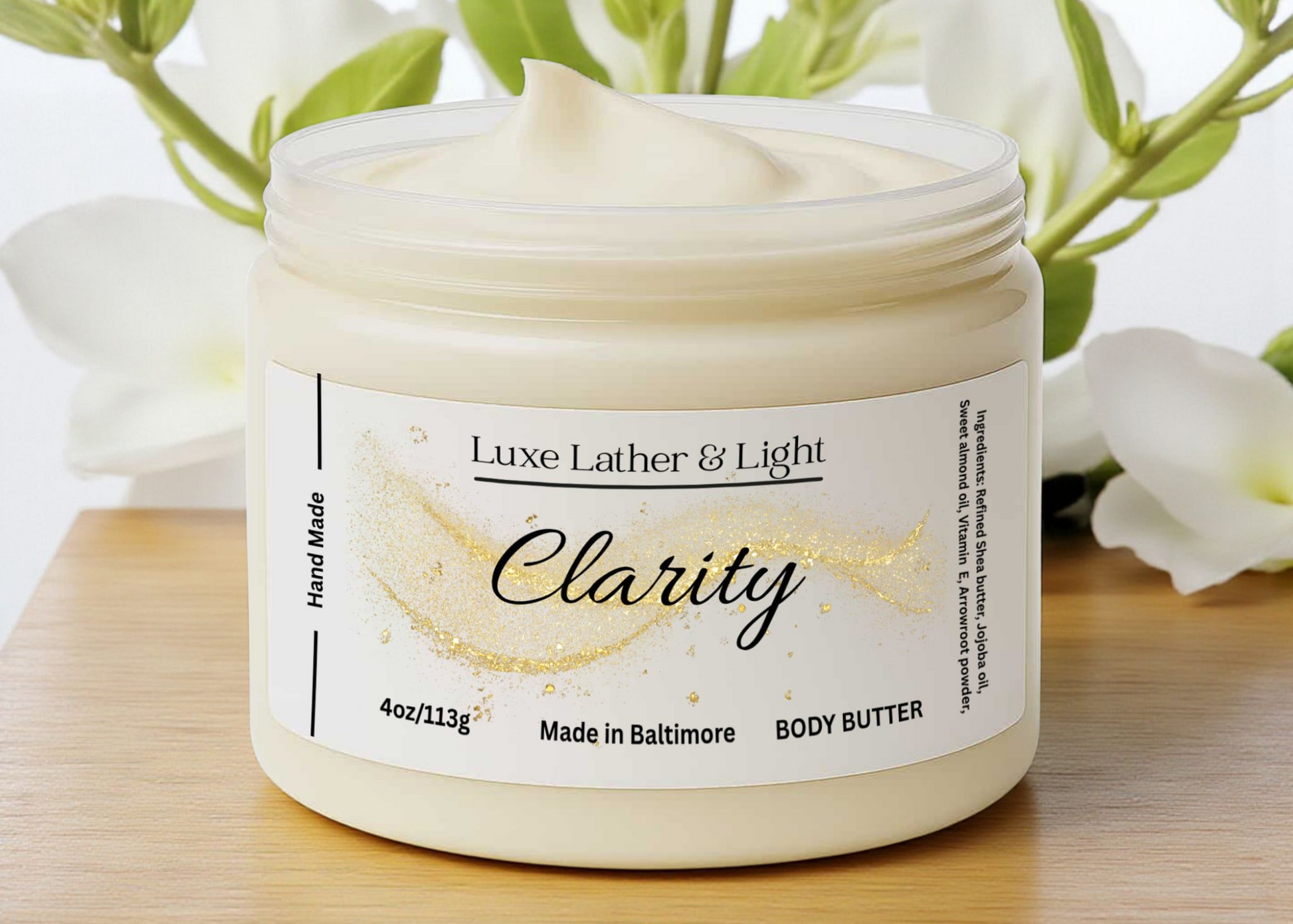 Breathe deep. Feel clear. Clarity is a cooling blend of peppermint and eucalyptus—whipped into a featherlight butter that awakens skin and sharpens the senses. With notes of crisp mint, herbal lift, and spa-like calm, this formula is your reset button in a jar.