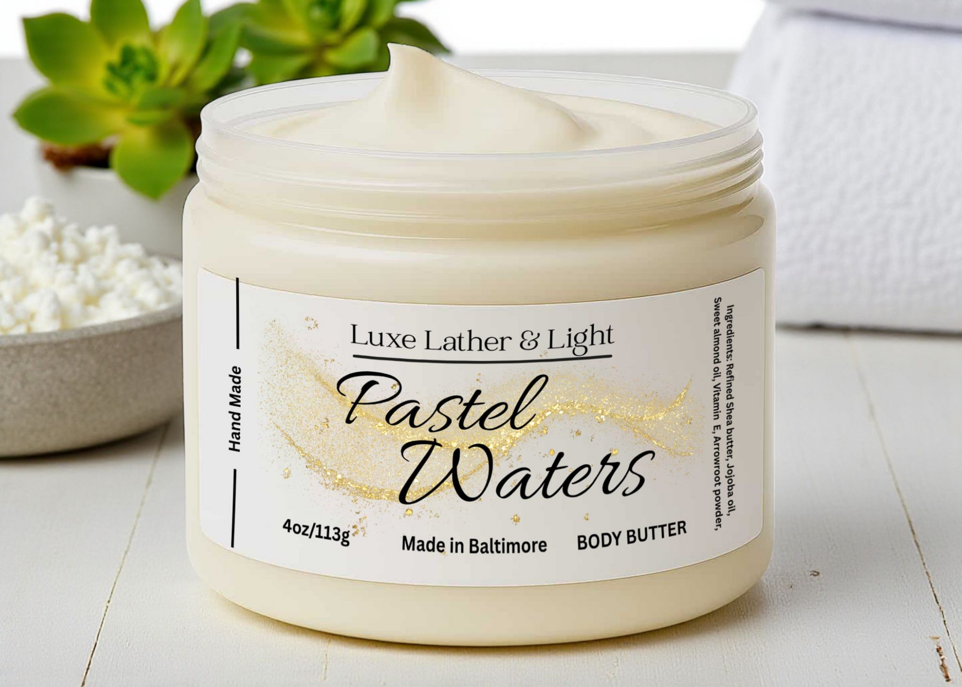 A hush of hydration. Pastel Waters is a delicate blend of water lily and creamy botanicals—whipped into a cloud-soft butter that glides like silk. Inspired by still mornings and watercolor skies, this formula soothes the senses with notes of dewy petals, soft ozone, and gentle freshness. It’s a whisper of wellness, a moment of peace in motion.