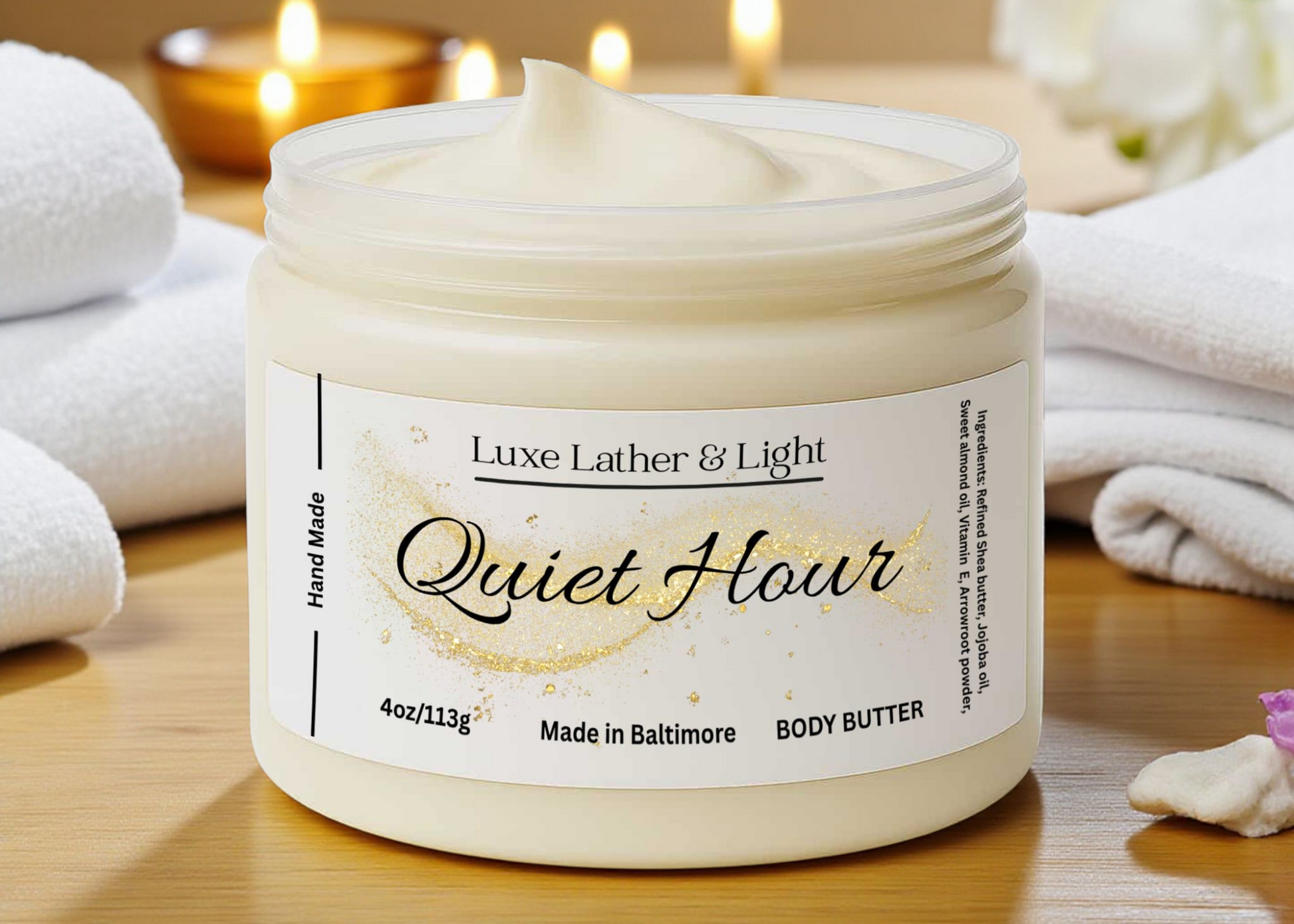 Stillness, sealed in softness. Quiet Hour is a calming blend—whipped into a cloud-like butter that soothes skin and spirit. With notes of clean musk, soft woods, and gentle warmth, this formula evokes candlelit evenings, deep exhales, and the sacred pause between moments.