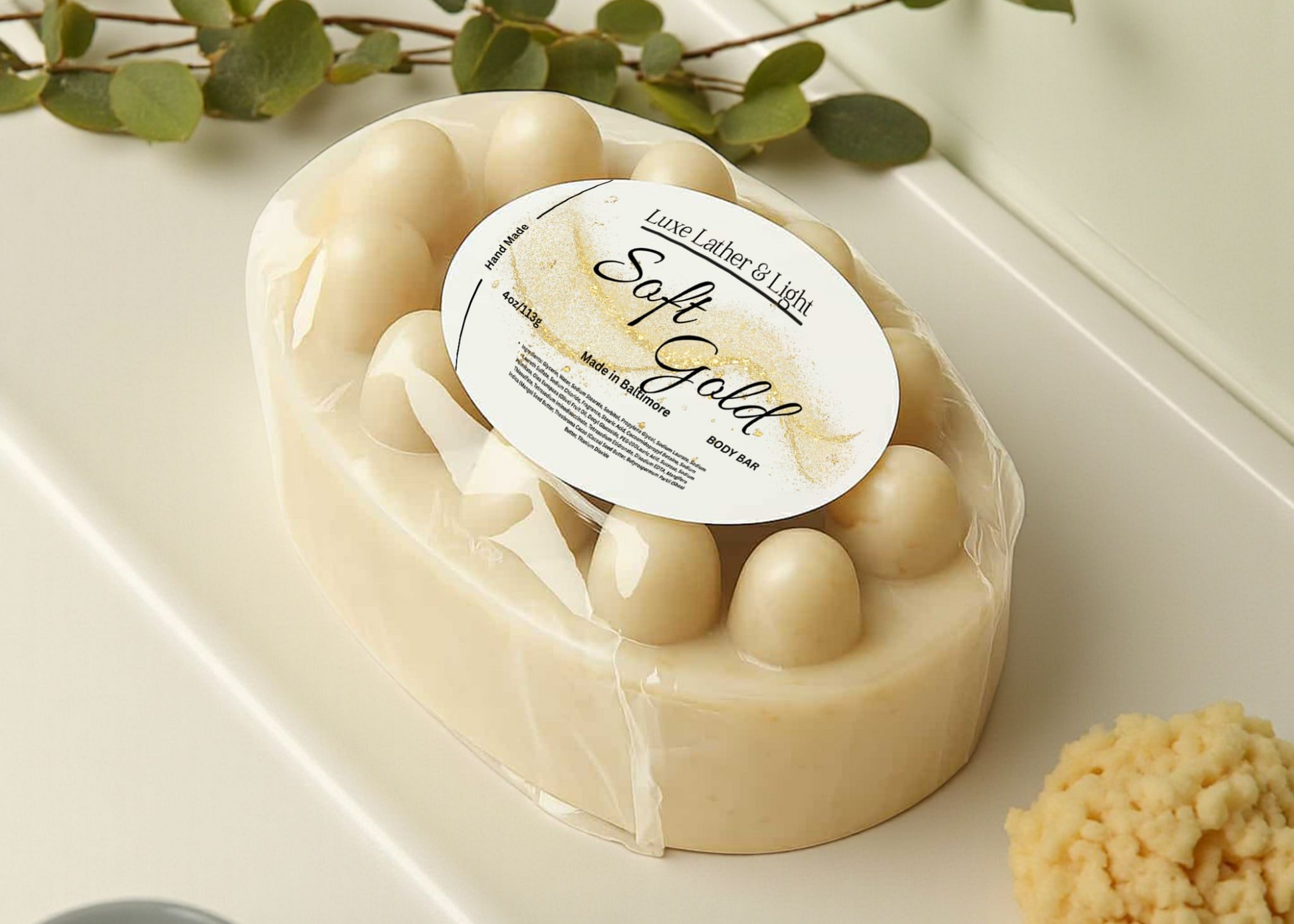 Glow in every lather. Soft Gold is a decadent bar—where golden warmth meets creamy depth. Each wash wraps skin in a velvety veil of amber, vanilla, and soft musk, leaving behind a subtle shimmer of comfort and elegance. It’s the scent of golden hour light, cozy luxury, and skin that feels kissed by warmth.